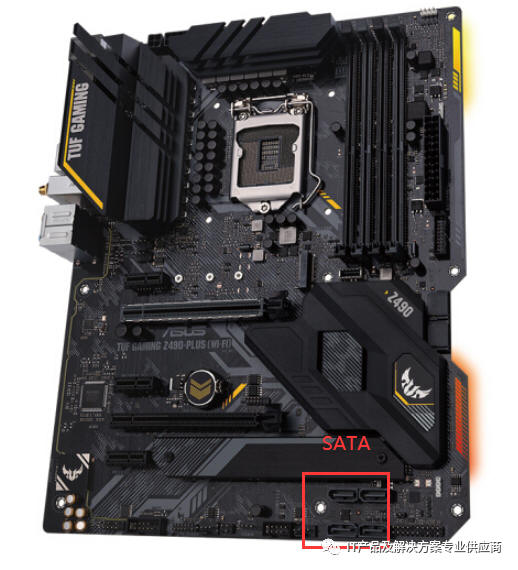 ,传输速度为6Gb/s,需要数据线连接固态硬盘和主板,主板上接口如下: