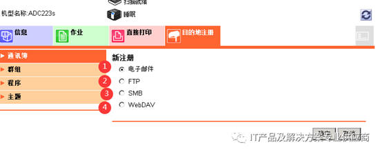 这里显示有4种方式传输扫描文档,电子邮件,直接发送到目的邮箱,FTP 传输到指定FTP服务器上,SMB 和WEBDAV