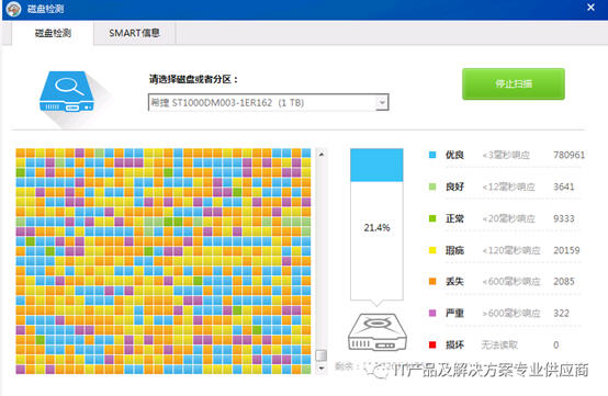 4160的速度,应该是硬盘有问题了,安装个测试工具试一下,各个温度指标都正常,通过安装鲁大师测试硬盘,发现正常工作时,几乎很少能看到紫色的斑块,大部分都是蓝色,早晨刚开机时,测试的结果就是这个样子的: