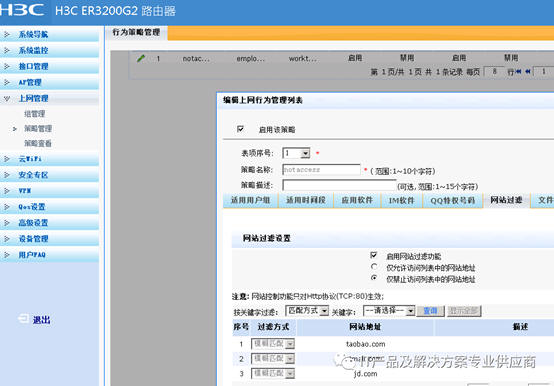5、上网管理中没有配置模板,只能自己一个网站一个网站的输入,有点麻烦,如果有更多的网站需要禁用的话,就需要花很长时间了: