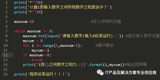 第11行 累加mysum=mysum+i 第一次循环结果就是1=0+1,第二次循环的结果是3=1+2,第三次的结果是6=3+3,依次类推,直到maxnum,循环结束后,通过第14行打印出来结果,这是for循环结束,还要执行while循环,循环嵌套,又重新提示输入数值,可以计算