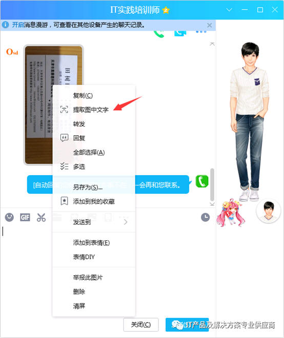 今天我们要掌握QQ的另外一种强大的功能,就是OCR的操作方法,OCR就是把你印刷体的图片,识别为可以通过Word、记事本等文字编辑器编辑的文本,具体操作方法,通过QQ拍照,或者传一个图片到QQ上,右键点击照片,弹出的窗口中选择提取文字: