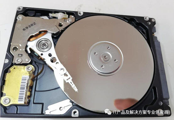 机械硬盘拆开的结构是这样子的,盘片非常亮,和镜子一样,数据就存在这上面,工作过程有点像点唱机播放音乐: