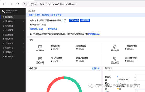 电脑管家小团队版,永久免费,云端管理,安装客户端后,管理员后台登录,可以看到所有团队电脑的工作状态,杀毒软件和网管软件的有机结合,功能实用,操作界面逻辑清晰,适合企业对整个网络的监管,包括关闭电脑、重新启动、远程协助等实用功能,支持微信登录管理、小程序。