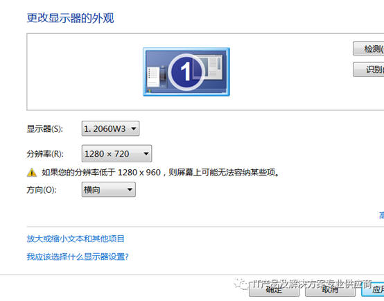 从这里可以设置选择其他的分辨率,如果屏幕小,分辨率很高,就是显示的图标、字体非常小,看着眼睛比较累,如果是分辨率比较低,显示的图标和字体就比较大,清晰度不够,有毛刺,就是这个效果的了: