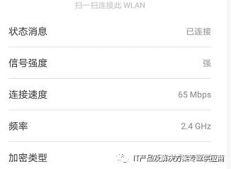 显示的连接速率是65Mbps是2.4G的WIFI,如果是5G的WiFi这里显示是5GHz,这个速率最大下载的速度是8MB,现在再购买手机一定要购买支持WIFI6的手机了,WiFi接入速度会达到1.2G.超过千兆网卡的接入速度了。