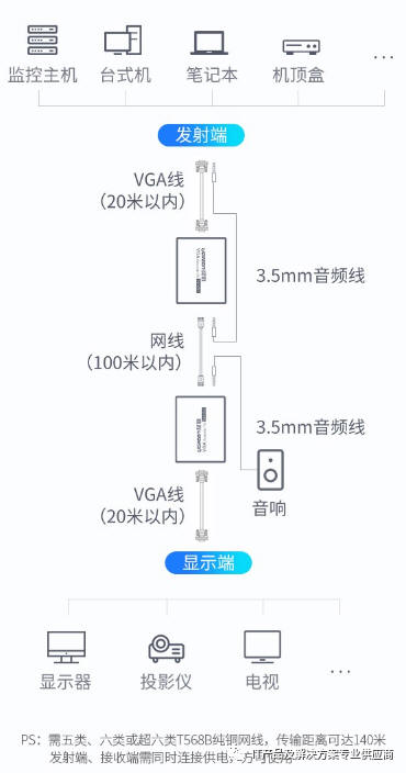 1、通过网线把VGA信号延长100米,点对点实时传输,解决远距离传输VGA信号的问题: