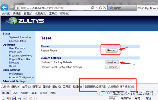 点击确定后,电话机就重新启动了,但是在谷歌的浏览器中就不行,没有反映,在默认的IE版本9.0中: