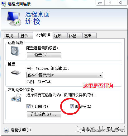 打开显示选项,选择如下本地资源,检查剪贴板是否打钩?