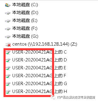 2、远程桌面登录以后,如果设置正确,本地电脑上的硬盘在远程服务器上是可以看到的,他们的显示形式如下: