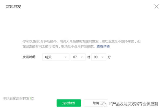 3、定时群发,我们希望在每天同一时间发布文章内容,就可以使用这个定时群发,你可以选择5分钟后的今、明两天内任意时刻定时群发,成功设置后不支持修改,但在设定的时间之前可取消,取消后不占用群发条数。