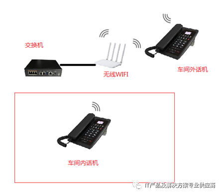 分配两个分机号码给两个WIFIIP话机,通过路由器同时注册到IPPBX上,实现内外互打,车间内容可以呼叫车间外,车间外可以呼叫车间内,同时扩展方便,只需添加无线WIFIIP话机就可以了,WIFI为2.4G信号;通话无时长限制,可以使用免费功能,满足更多人同时通话的要求。
