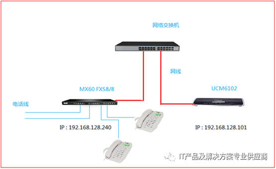 1、物理网络连接,将MX60模拟语音网关和UCM6102接入到同一个局域网中,或置于都有固定IP地址的公网环境中,连接示意图如下: