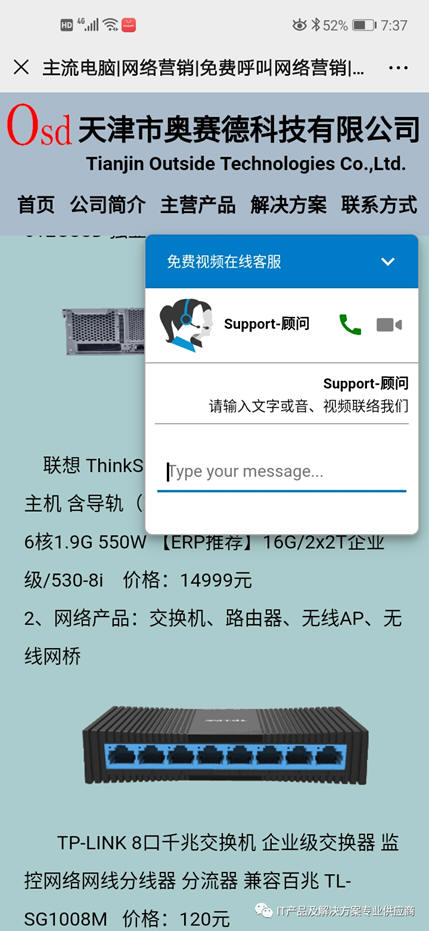 在微信中打开一个带有免费视频在线客服呼叫的链接,类似这样的,https://www.tjosd.com我们打开,屏幕的右上角有一个蓝色的按钮,默认免费呼叫界面是最小化的,需要展开,点一下这个免费呼叫图标,就可以看到免费音频或视频呼叫的按钮了,点击绿色的这个小电话,是仅仅发起音频呼叫,点击灰色的视频图标,可以同时发起音频视频通话,如果通过电脑浏览器打开时,默认按钮是展开的,下面我们点击视频通话按钮试一下,点击以后会弹出一个提示窗,是否允许使用摄像头和麦克风,选择允许就好了,这样就接通了,这是彩铃,等客服人员应答以后,就可以免费视频沟通了,点击这个红色按钮挂断通话,是不是很方便?你也试一下看。