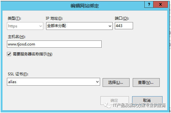 在网站绑定对话框中单击添加>选择https类型>端口选择443>导入的IIS证书名称>确定。