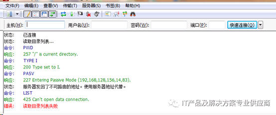 当我们把FTP服务器的端口映射后,发现并不能正常实现FTP的数据传输,每次提示的信息都是: