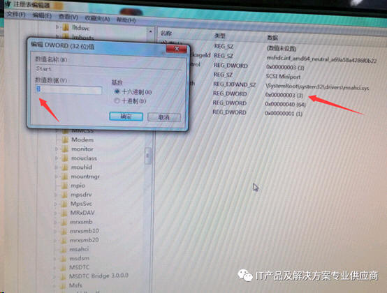 1、运行regedit,编织注册表,找到到HKEY_LOCAL_MACHINE\System\CurrentControlSet\Services\Msahci,“Start”项值改为“0”。