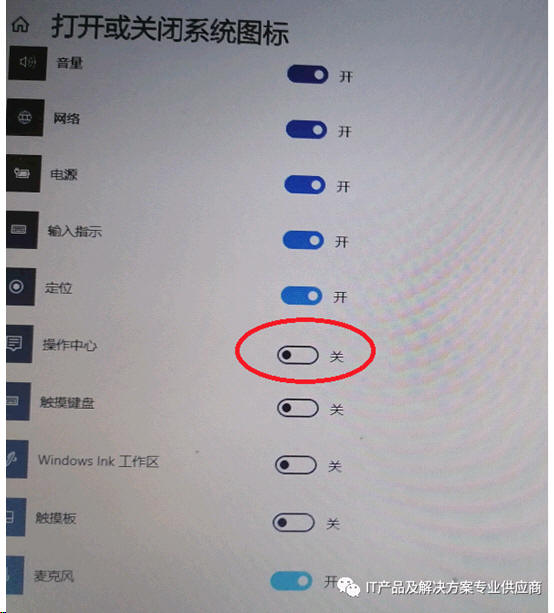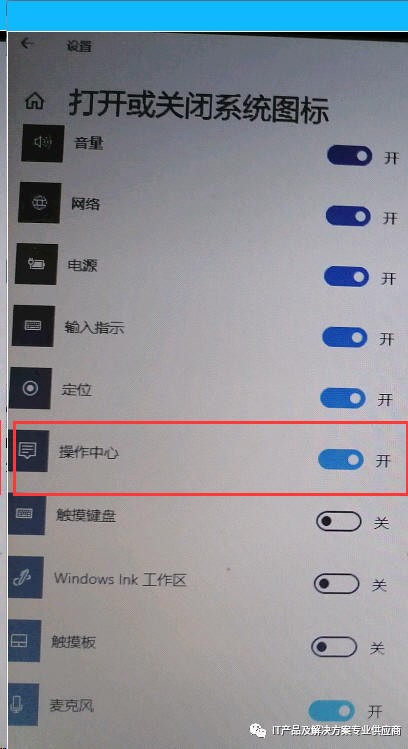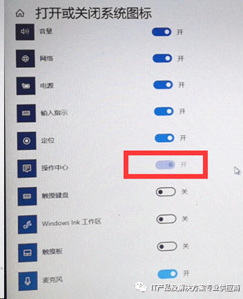 操作中心的这个选项是关闭的状态,把他打开,处于开的状态就好了。这看上很简单,似乎没有什么难度,每个人都可以操作的,但是如果你看到是这个界面,是灰色的,不让你操作,是不是有点头大了,这又该如何搞呢?