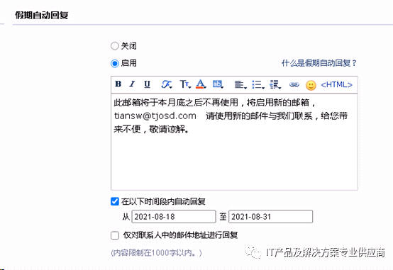 通过这里设置假期自动回复,当系统收到邮件后会自动回复一封包含本内容的邮件给对方,每天只发送一封,不重复发送。如果邮件标题中有自动回复字样,将不进行邮件自动回复操作,防止循环操作。