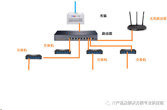 这个结构中路由器通常都设置启用DHCP server,开启DHCP 的服务,这个服务开启后,所有的交换机获得的IP地址都是有这个DHCP server分配的IP地址,比如 ;192.168.1.x 这个网段。