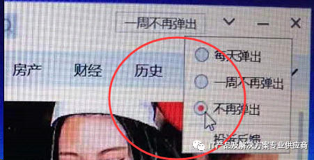 在弹出窗口时,先别急着关闭该窗口,在这窗口上找一下具有设置选项的图标或者按钮,或者其他标识,通常都是下拉菜单,可以选择选项不再弹出这个选项,有时很隐蔽,需要到三级菜单才能找到这个选项。