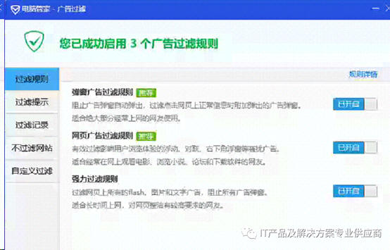 还可以通过杀毒软件或者安全卫士之类的免费工具,设置网站弹窗广告过滤规则,不让他们弹出来。