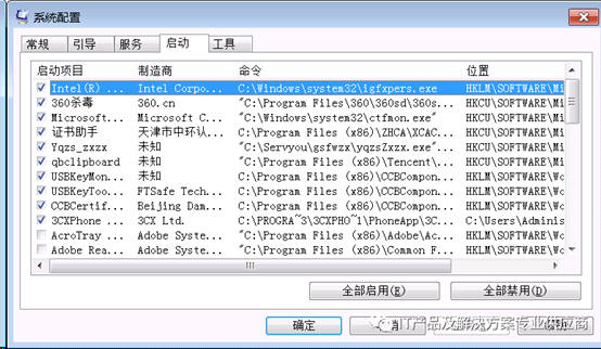 电脑启动项中和弹出窗口有关的应用程序一律禁止启用:如果打勾,电脑启动时就会一起启动,无论你是否使用,都会自动启动,如果不打勾,需要时再启动,可以提高电脑开机速度。 打开这个界面的方法是,在命令行中输入msconfig
