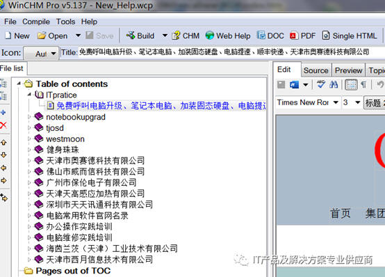 首先创建一个新的帮助文档,导入已经编辑好的HTML文档,比较麻烦,需要逐个网页导入,无法通过拖拽完成导入,添加每个网页的名称,都导入后,看不到图片,图片编译后会打包到SCR中,左侧看到的都是网页的名称和标题,编译时要选择WEB HELP 这选项,根据需要设定标题,输出到指定的目录中,如果原先有编译好的文档,系统会提示全部删除原先的所有记录,如果不是同一个项目,记得保存,防止误删除。