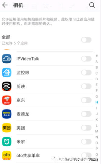 这个选项可以让应用程序随时使用相机,不需要再次确认,所以要关掉;没有用的一定要关掉。