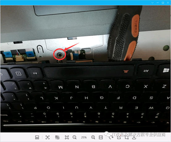 键盘的下面还有一个螺丝,卸掉这个螺丝后,后盖可以打开了,这个设计有点毛病,如果设计在背面直接固定螺丝也可以,为什么还有拆键盘,可能是防止客户方便拆后盖设计的吧。