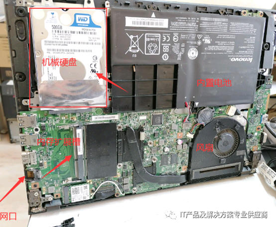 这是拆开后的内部结构,我们看到了硬盘,就是要替换这个东西,为了防止意外,可以先把内置电池插头拔掉,万无一失了。