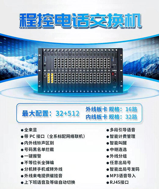 最大配置为32外线 512分机 ,模拟机,非常适合大型宾馆、企业、厂矿的企业内部通讯解决方案,同时为改造已有的设施提供了理想的替代产品。