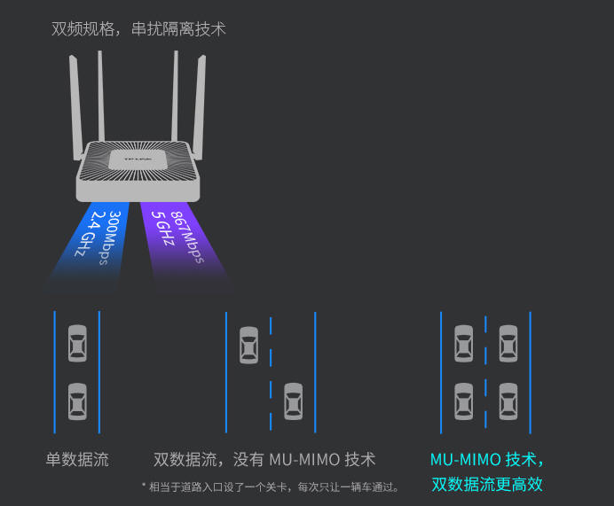 这图比较直观的展示了无线路由器的传输数率 2.4G 是300Mbps 5G的是867Mbps,加在一起一共是1167Mbps , 标称就是1200Mbps