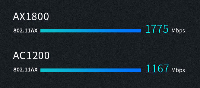 1800是802.11ax的传输数率,就是常说的WIFI 6 1775Mbps 2.4G:574Mbps 5G:1201Mbps 一共是1775Mbps