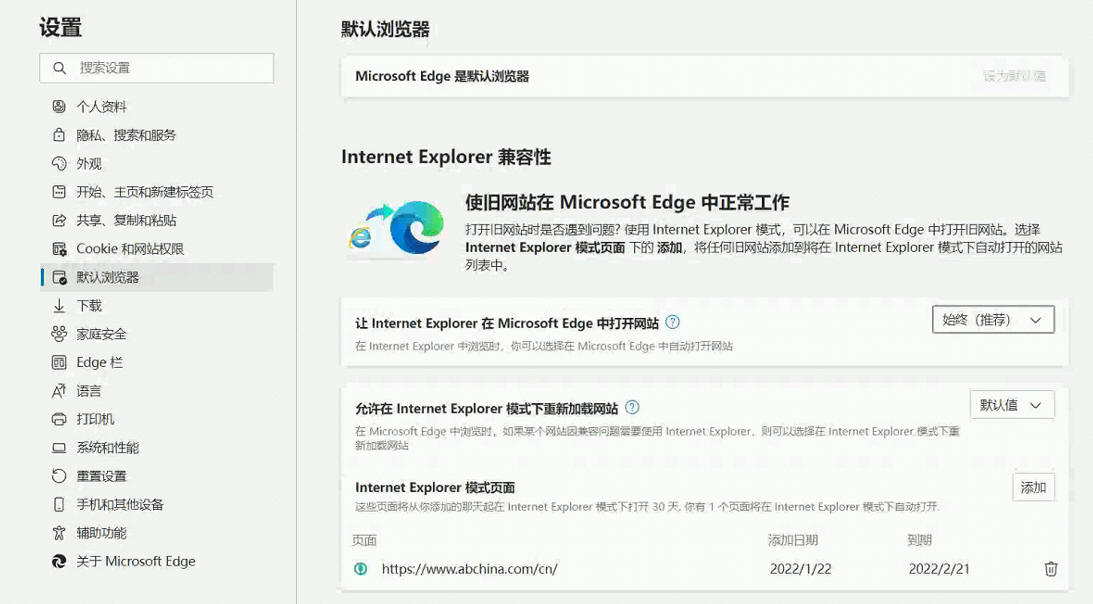 这种图标都在状态栏中的显示效果就说明已经升级到了Windows11,升级后EDGE 浏览器代替了原先的IE浏览器,原先基于IE浏览器的一些操作受到了影响,可以这样解决:从Edge 右上角找到浏览器设置,选择让Internet Explorer 在Microsoft Edge 中打开网站,设置为始终,在下面添加需要IE浏览器才能操作的网站的网址,在IE模式中可以重新加载网站,就可以正常支持原先的操作了。